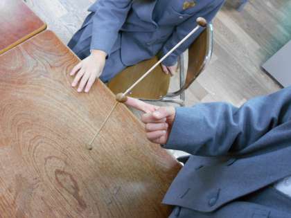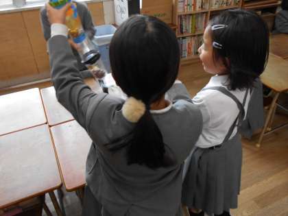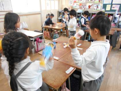 生活科の学習で、どんぐりやまつぼっくりを使って秋のおもちゃを作りました。やじろべえやけん玉、こまなど、グループに分かれておもちゃを作り、みんなで遊びました。遊び方がわからない友だちには優しく教え、協力して楽しい時間を過ごすことができました。