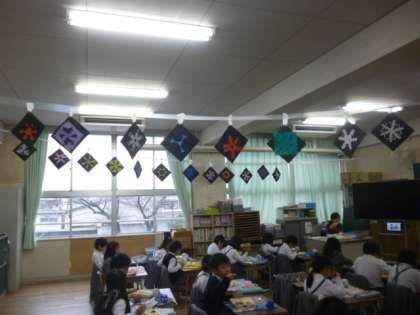 1年生の教室の様子です。クリスマスモードで、折り紙で作った結晶が掲示してありました。とてもきれいです!