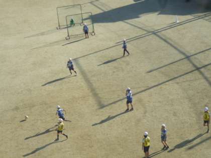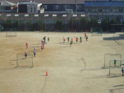 5年生、体育の授業の様子です。サッカーに取り組んでいます。寒さに負けず、元気にグラウンドを駆け回っています!