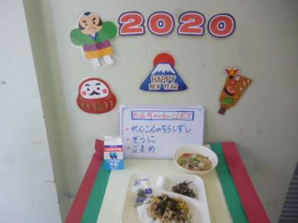 子どもたちは久しぶりの給食にとてもおいしそうに食べていました!給食室も正月仕様です。