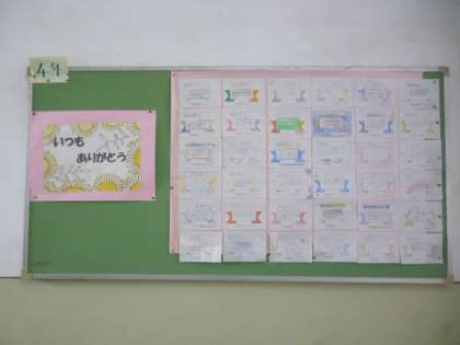 4年生、学年掲示です。「いつもありがとう」というテーマで、友だちにお手紙を書きました。心あたたまるメッセージがたくさんありました!