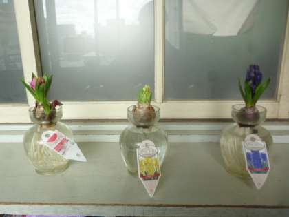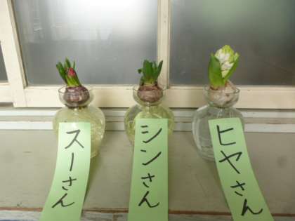 1年生の教室前で栽培しているヒヤシンスです。だんだん大きくなってきました。花も少し咲いてきているようです。