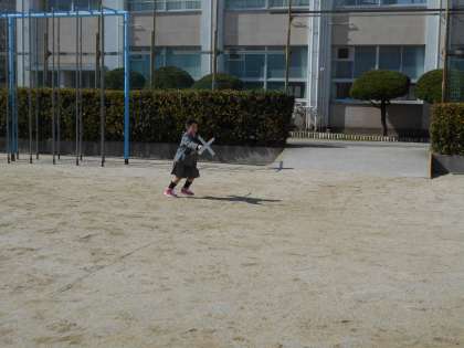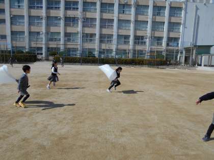 生活科の学習で風車を体験しました。走ると風をうけて、風車が速く回るので、すごく楽しそうにしていました。ポリ袋をもって風をうけることもあわせて行いました。冷たい風が強く吹いていましたが、たくさん走って汗だくになっていました。