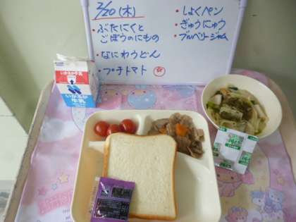 とろろこんぶをのせて食べるうどんを、大阪市の給食では「なにわうどん」とよんでいます。