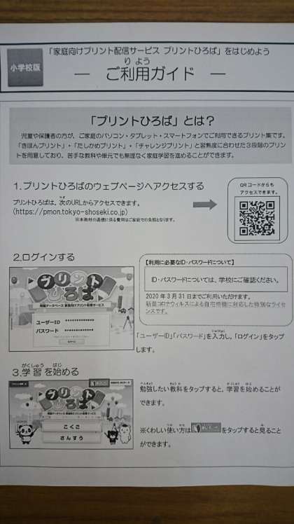 つきましては、担任より配付しております課題に加えて、必要なご家庭は添付しております「ご利用ガイド」を参考にご活用ください。なお、利用にはユーザーIDとパスワードが必要です。下記のとおりです。