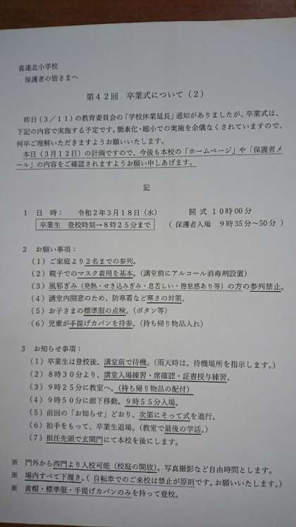教育委員会より「学校休業」の延長が、3月22日(日)より更に23日24日も加わり、25日からの春季休業につながってしまいました。しかし、23日24日は臨時休業中の登校日となりました。この両日の対応内容は、このあとのホームページでお伝えいたします。卒業式について(2)をご一読ください。