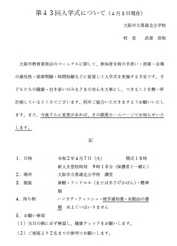第43回入学式についての計画です。内容は下記の通りです。ご確認、よろしくお願いいたします。