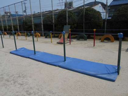 安全のために、鉄棒のところにもマットを置いています。学校が再開したら、いろいろな技にチャレンジしてくださいね!