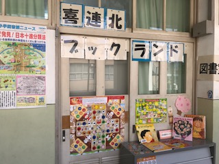 新1年生のみなさんに図書室を紹介します!図書室前の廊下には、「喜連北ブックランド(立ち読み&すごろくコーナー)」がありますよ。