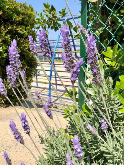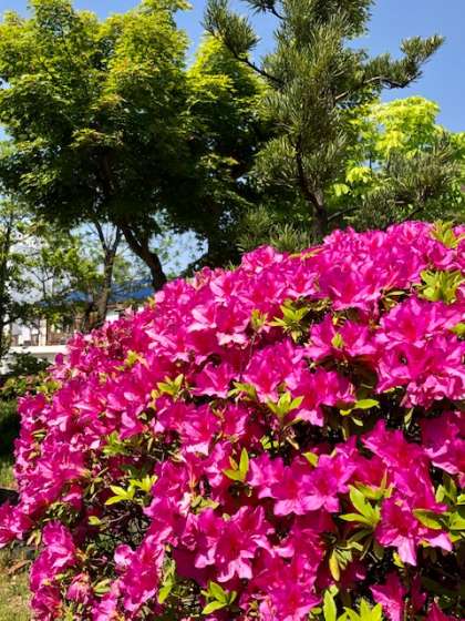 強い日差し・青空・学校の植物などみんな輝いています。