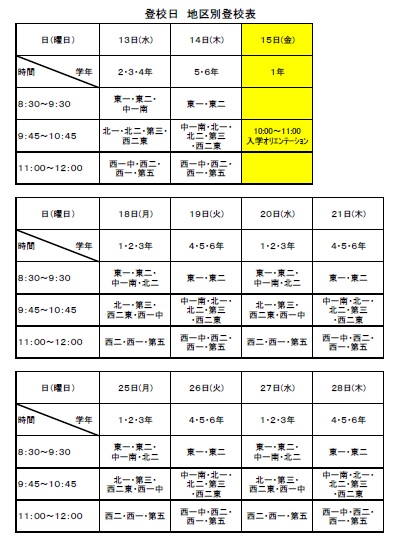 先週に臨時休業の延長と登校日をお知らせしましたが、いよいよ明日からです。今週は各学年1日、来週からは各学年2日となります。3月の登校日と同様、地域別での登校になりますので、時間等お間違えのないようよろしくお願いいたします。