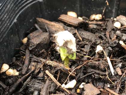 今日のお昼過ぎに発芽しました。わたの種の帽子をつけての発芽です。