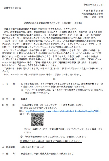 本日、1〜3年生に配布しましたお手紙についてですが、一部変更がありましたのでお知らせいたします。大きな変更ではありませんが、こちらでご確認いただきますようお願いいたします。なお、モバイルルーター貸し出しのための重要なアンケートですので、必ずご回答ください。