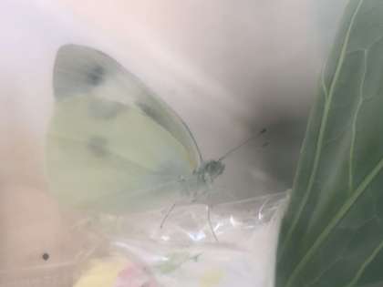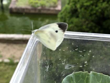 ホームページでたまごから紹介していたモンシロチョウがさなぎからチョウに成長しました。チョウになってすぐは羽をかわかすためにうごきません。