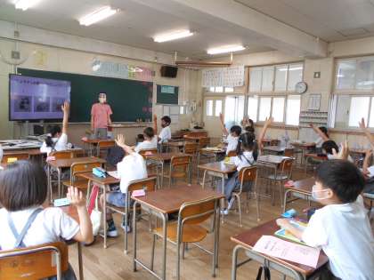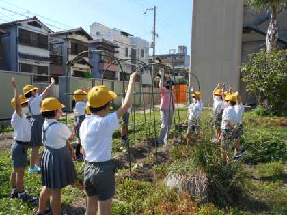 4年生、理科の学習の様子です。4年生になって初めて学習園に観察に行きました。ヘチマやひょうたんの成長の様子を調べています。