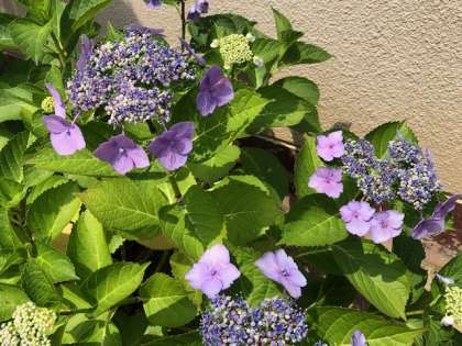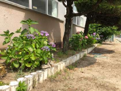 家庭科室から職員室にかけていろいろな種類の紫陽花が咲いています。