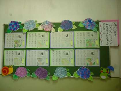 書写プリントが掲示されています。お手本そっくり、立派な字で書かれています。まわりには、季節にあわせて紫陽花が掲示されています。とても華やかです!