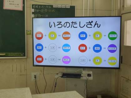 3年生、授業の様子です。図工の学習をしていました。自分で線を加えた気球に絵の具で色をつけていました。「いろのたしざん」を見ながら、自分の好きな色で塗ることができました。