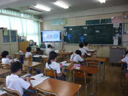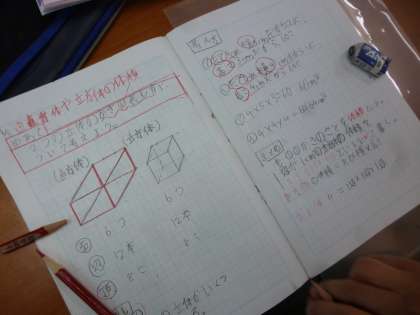 5年生、授業の様子です。算数「直方体と立方体の体積」の学習をしました。とても工夫してノートを書くことができています。