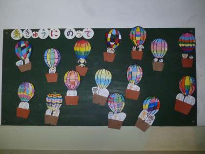 先週、絵の具で塗った気球を掲示しています。気球には、かわいい動物や自分、友だちが乗っています。実際に、気球に乗りたくなるような絵になりました!