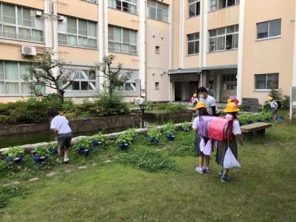 低学年児童はあさがおやトマトの水やり・観察から1週間のスタートです。