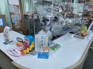 図書委員会では、本の貸し出しを行うために写真のような飛沫防止シートを作成しました。街のスーパーでもよく見かけるあれです!!これで、安心して本の貸し借りを行うことができますね。
