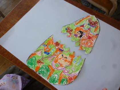 「ひみつのたまご」を作成していました。2つは違う児童の作品ですが、上の写真は1週間前の写真です。はじめに、カラフルなたまごを描き、今週はたまごから生まれた自分で想像した生き物を描きました。いろんな作品が完成しました!