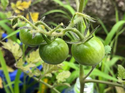 「池泉庭」のまわりで育てているミニトマトが青い実をつけています。雨が降り始めてきました。今日・明日は雨となりそうです。傘をさしながら1列で登下校するとソーシャルディスタンスの学習ができるようです。友だちと適度な距離を維持するために今日・明日がチャンスかもしれません。