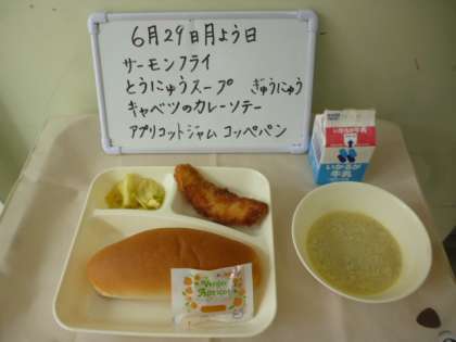 豆乳スープは、ベーコン、にんじん、玉ねぎ、じゃがいも、コーン、パセリが入った人気のメニューです。サーモンフライ、キャベツのカレーソテーも好評でした。