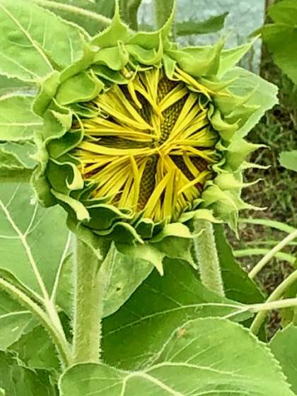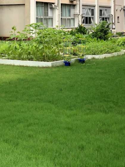 雨上がりの中庭です。先月26日に喜連北地域芝生委員会の皆様に整えていただいた芝生が生き生きとしています。芝生のむこうの花壇にはヒマワリがすくすくと育っています。もうすぐ花が咲きそうです。