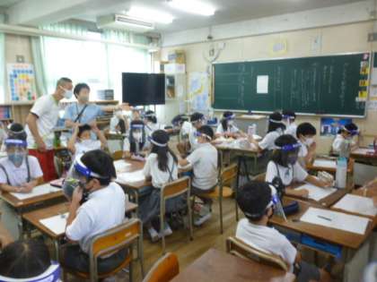 4年生の国語科、新聞作りの学習の様子です。どんな記事にするか、どうやって取材するか、グループで考えています。グループで話し合うときには、フェイスシールドを着用しています。活発に意見を交わしていました。どんな新聞ができるか楽しみです!