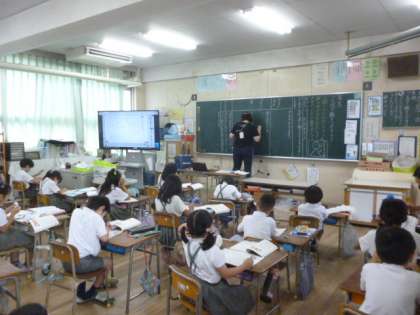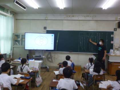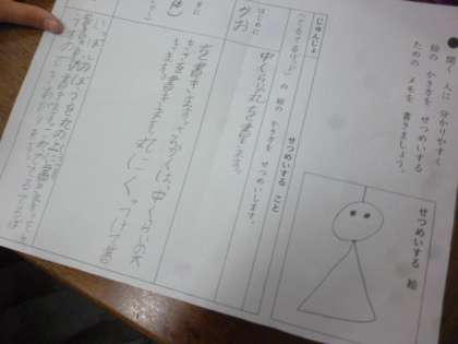 国語科「ことばで絵をつたえよう」の学習をしています。丸や三角などの形の名前、場所の説明の仕方などについて学んでいます。分かりやすく説明する方法について子どもたちは一生懸命考えていました。