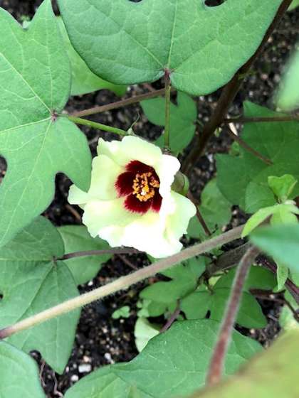 区の花「わた」を育てています。今朝、第1花を見つけました。地面の近くの下の方に咲いています。