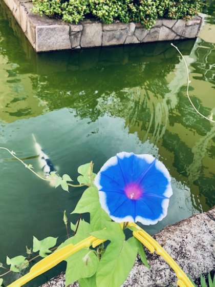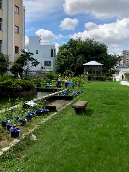 やっと晴れました。低学年の生活科の始動です。池泉庭のまわりには「アサガオ」の花が咲いていたり、「ミニトマト」の実ができていたり、夏の生活科って感じです。