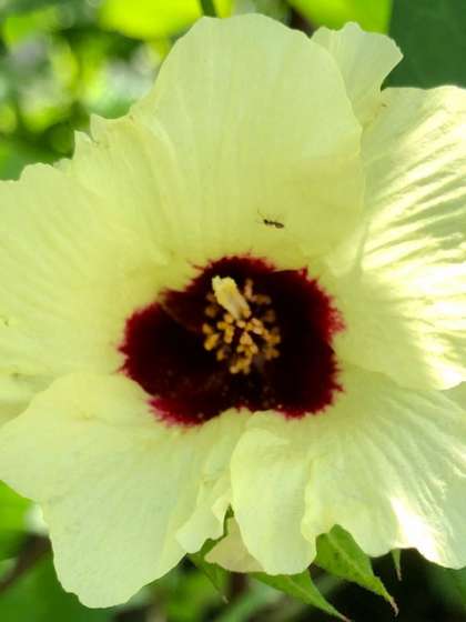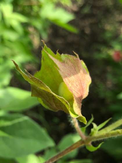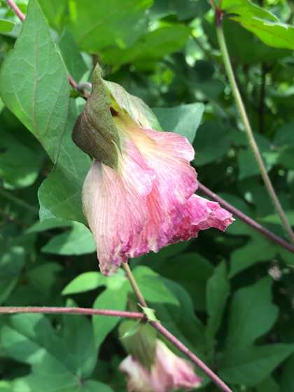 平野区の花「わたの花」が咲いてきました。「つぼみ」「開花」「受粉」の時期でしょうか。花の中にアリがきています。たった1日だけの開花ですぐにしぼんでしまいます。しぼむと赤色が増してきます。ほんとうに不思議な花ですね。