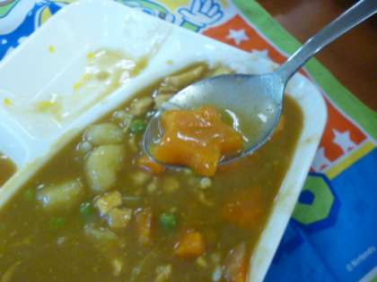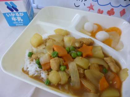毎回、好評な「チキンカレーライス」は、鶏肉を主材に、みじん切りのにんにくとりんごピューレでうまみが増しています。今日は、ラッキーにんじんDAYでした!