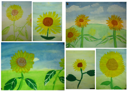 学年掲示板に美しいひまわりが掲示されています。水に量を調節しながら、空を描きました。そこに大きなひまわりを描きました。どのひまわりもしっかりと特徴をつかんで描くことができています。