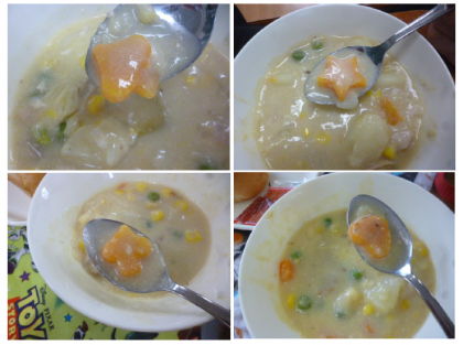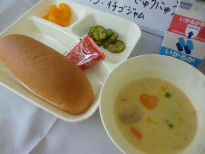 「コーンクリームシチュー」は、鶏肉を主材に、スイートコーン(クリーム缶)の甘みをいかし、バターを使った手作りルウで仕上げたシチューです。