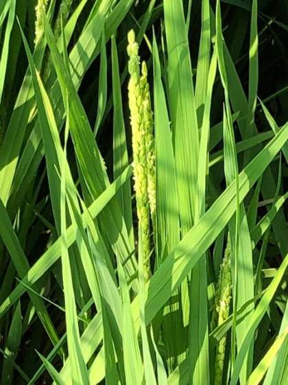 いつも観察させてもらっている5丁目の水田です。お米の花を見つけました。稲穂のまわりについている白い小さな花です。暑い朝の2時間ぐらいしか咲いていないようです。受粉して、実になり、お米になって実りの秋を迎えることになります。さて、今日から2学期です。コロナ禍ですが感染拡大防止マニュアルに則って2学期の学校行事をすすめていきます。実りの秋をめざして。