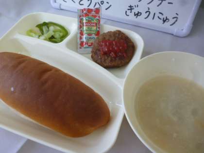 「焼きハンバーグ」は、60gの製品のハンバーグを焼き物機で焼いています。一人一袋ずつケチャップがつきます。