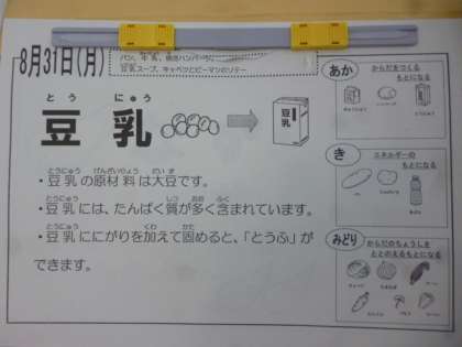 「豆乳スープ」は、ハンバーグとの関係で、アレルギーの重なりをさけるため、チキンブイヨンのかわりに、肉類を含まない野菜ブイヨンを使用しています。