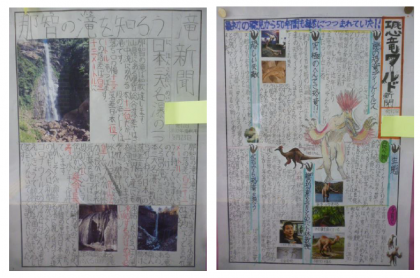 今月の玄関掲示は5年生です。夏休み新聞と二学期の目標を熟語で表したものを掲示しています。夏休み新聞は、夏休みの出来事や興味のもったことを新聞にまとめました。それぞれ個性のあふれる新聞になっています。二学期の目標は、国語辞書で意味を確認して、自分の目標にふさわしい熟語を決めて、習字で書きました!