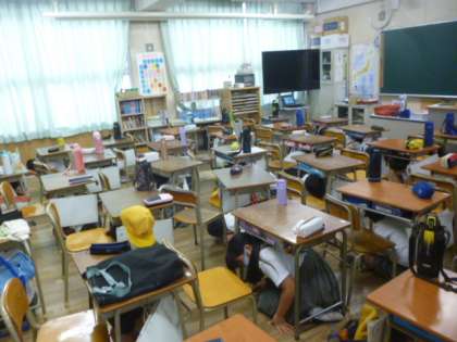 訓練の様子です。先生の指示にしたがって、子どもたちはすばやく机の下に隠れていました。