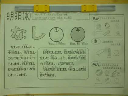 今日の梨は元々、豊水の予定でしたが不作のため二十世紀梨に変更となりました。1人1/4切れずつつきます。喜連北小学校では、105個の梨の皮をむきました。