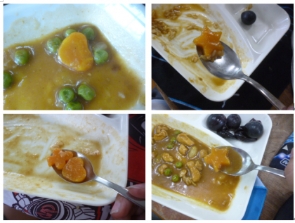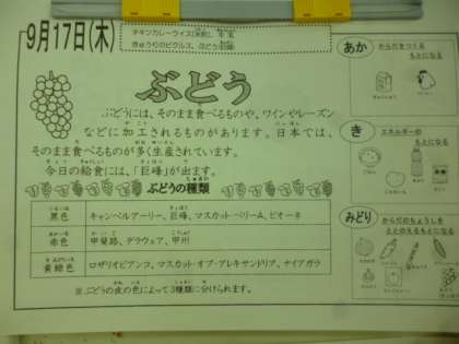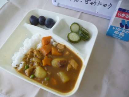 今日のチキンカレーライスには、ラッキーにんじんが入っています。入っていた児童はとても喜んでいました。ぶどうも上手に皮をむいて、よく噛んで食べていました。