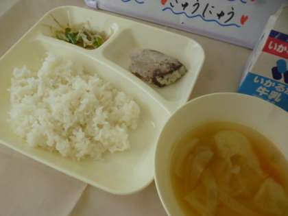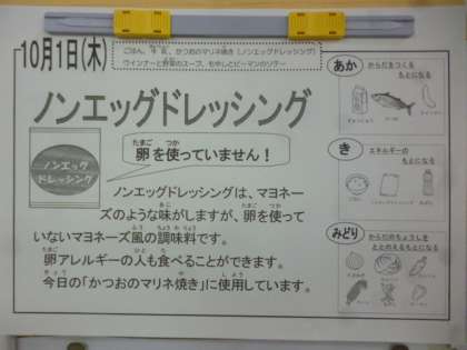 「かつおのマリネ焼き」は、卵アレルギーの児童も食べることができるノンエッグドレッシングを使っています。塩、こしょう、ノンエッグドレッシングで下味をつけたかつおを焼き物機で焼きます。ノンエッグドレッシングでかつお独特の臭味も消えて食べやすくなっていました。