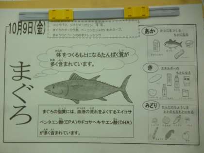 「まぐろのオーロラ煮」は、しょうが汁で下味をつけたまぐろにでんぷんをまぶして、ケチャップ、砂糖、赤みそをあわせたものをからませます。児童に大人気のメニューです。