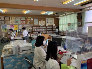 図書館開放の様子です。学力向上サポーターの先生が見守ってくれています。本を読む前や読んだ後は、しっかりと手を洗いましょう。