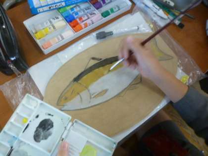 5年生は図工の学習で「伝言板」を作成しています。先週、電動のこぎりで切った木を絵の具で丁寧に塗っています。ソーラン節に影響されたのでしょうか・・・鰊(ニシン)の伝言板です!
