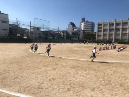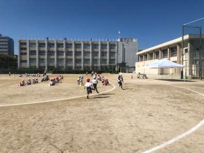 1年生の子どもたちがが一生懸命に走っています。応援・待機している子どもたちのフィジカルディスタンスもうまくできています。10月31日(土)が楽しみです。